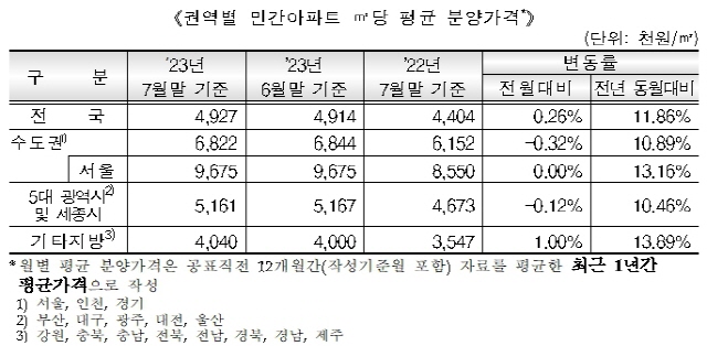 16일 주택도시보증공사(HUG)가 발표한 2023년 7월말 기준 ‘민간아파트 분양가격 동향’에 따르면 전국 민간아파트는 최근 1년간 ㎡당 평균 분양가격(공급면적 기준, 이하 ㎡당 평균 분양가격)은 492만7000원으로 전월 대비 0.26% 상승했다고 밝혔다.