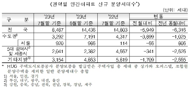 또 2023년 7월 수도권 신규 분양가구 수는 총 3292가구, 5대 광역시와 세종시는 총 2041가구, 기타지방은 3154가구가 신규 분양됐다.