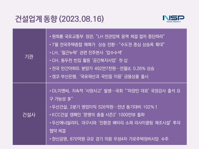 (서울=NSP통신) 정의윤 기자 = 지난해에 이어 올해도 ‘안전강화’ 대책 없이 사망사고를 일으켜 마창민 DL이앤씨 대표가 올해 국정감사에 또다시 소환 될 가능성이 높아졌다. 이와 함께 경찰은 최근 ‘철근누락’과 관련해 한국토지주택공사(LH) 진주 본사를 압수수색했다.