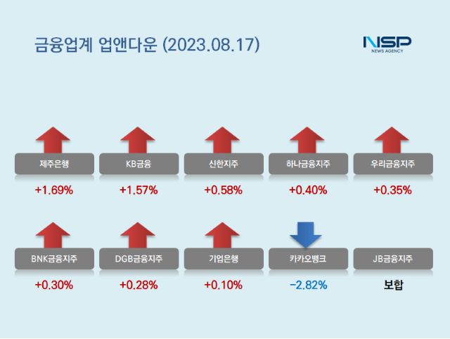 (서울=NSP통신) 강수인 기자 = 17일 코스피(+0.88%)와 코스닥(-0.32%)은 모두 하락했다. 이 가운데 은행주는 전거래일 대비 0.21% 상승했다. 은행주는 11종목 가운데 8종목이 상승, 2종목이 하락했다. 보합세는 1종목이다.