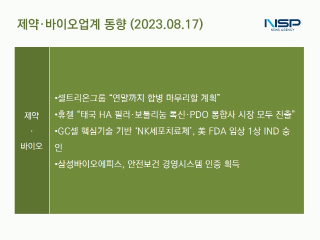 (서울=NSP통신) 김다은 기자 = 셀트리온이 셀트리온헬스케어를 흡수합병한다. 이와 함께 휴젤이 태국 식약청으로부터 히알루론산 필러 ‘레볼렉스’에 대한 품목허가를 획득했다.
