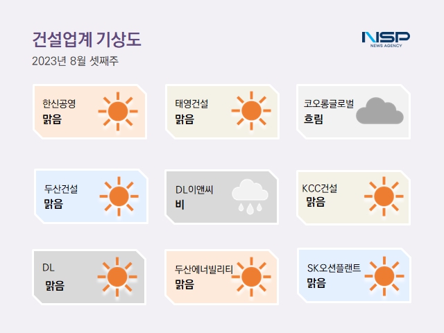 (서울=NSP통신) 정의윤 기자 = 2023년 8월 3주차 건설업계기상도는 한신공영·태영건설·두산건설·KCC건설·두산에너빌리티·SK오션플랜트·DL의 ‘맑음’, 코오롱글로벌의 ‘흐림’, DL이앤씨의 ‘비’로 기록됐다.
