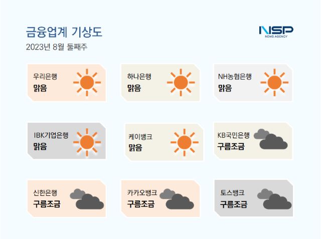 (서울=NSP통신) 강수인 기자 = 2023년 8월 3주차 금융업계기상도는 하나은행·우리은행·NH농협은행·IBK기업은행·케이뱅크의 ‘맑음’, KB국민은행·신한은행·카카오뱅크·토스뱅크의 ‘구름조금’으로 기록됐다.
