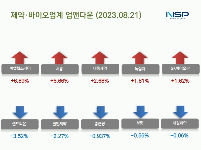 이 밖에 대웅제약(+2.68%) 경보제약(+2.58%) 한미사이언스(+2.17%) 녹십자(+1.81%) SK바이오팜(+1.62%) 동아에스티(+1.60%) 삼성바이오로직스(+0.91%) 삼진제약(+0.90%) 국제약품(+0.88%) 유한양행(+0.82%) 광동제약(+0.80%) 한미약품(+0.66%) 동화약품(+0.53%) SK바이오사이언스(+0.40%) 일성신약(+0.23%) 에이프로젠(+0.20%) 일양약품(+0.06%) 등이 상승했다.