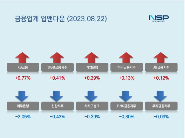 (서울=NSP통신) 강수인 기자 = 22일 코스피(+0.28%)와 코스닥(+0.52%)은 모두 상승했다. 이 가운데 은행주는 전거래일 대비 0.07% 상승했다. 은행주는 11종목 가운데 5종목이 상승, 6종목이 하락했다.