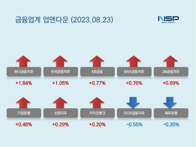 (서울=NSP통신) 강수인 기자 = 23일 코스피(-0.41%)와 코스닥(-1.15%)은 모두 하락했다. 이 가운데 은행주는 전거래일 대비 0.70% 상승했다. 은행주는 11종목 가운데 9종목이 상승, 2종목이 하락했다.