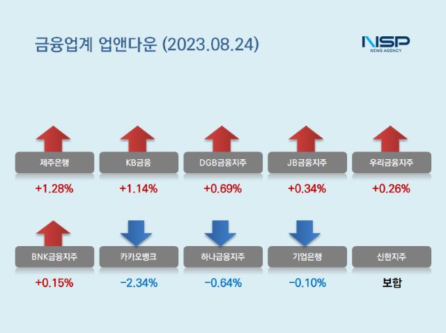 (서울=NSP통신) 강수인 기자 = 24일 코스피(+1.28%)와 코스닥(+2.14%)은 모두 상승했다. 이 가운데 은행주는 전거래일 대비 0.08% 하락했다. 은행주는 11종목 가운데 7종목이 상승, 3종목이 하락했다. 보합세는 1종목이다.