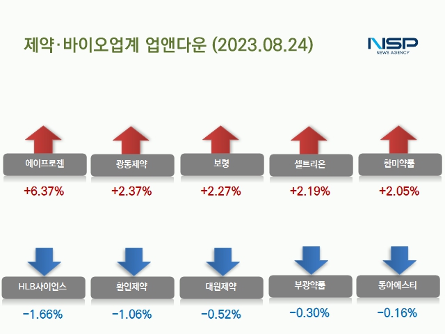 이 밖에 보령(+2.27%) 하나제약(+2.21%) 셀트리온(+2.19%) 한미약품(+2.05%) 삼성제약(+1.99%) 한올바이오파마(+1.96%) 일양약품(+1.71%) 더메디팜(+1.63%) 삼진제약(+1.13%) 제일파마홀딩스(+1.08%) 녹십자(+1.04%) 경보제약(+0.96%) JW중외제약(+0.89%) 유한양행(+0.80%) 서흥(+0.70%) 대웅재약(+0.57%) SK바이오사이언스(+0.41%) 현대약품(+0.37%) 한독(+0.30%) 유유제약(+0.22%) 일동제약(+0.19%) 종근당(+0.12%) 동아쏘시오홀딩스(+0.11%) 등이 상승했다.