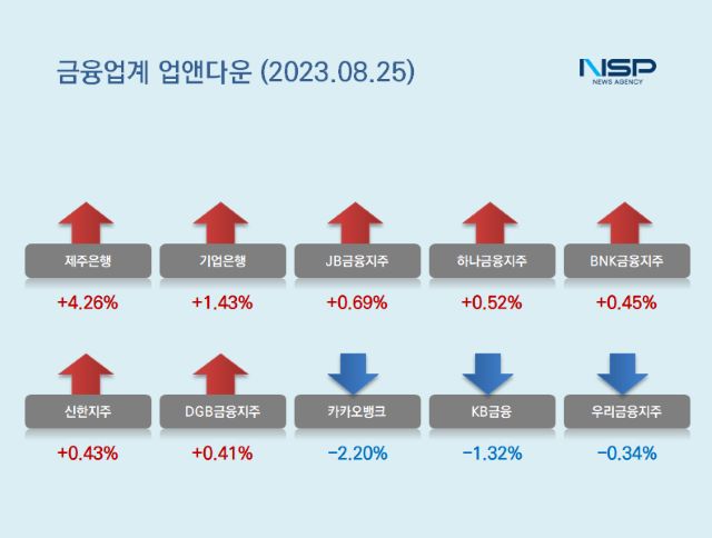 (서울=NSP통신) 강수인 기자 = 25일 코스피(-0.73%)와 코스닥(-0.26%)은 모두 하락했다. 이 가운데 은행주는 전거래일 대비 0.31% 하락했다. 은행주는 11종목 가운데 7종목이 상승, 3종목이 하락했다. 보합세는 1종목이다.