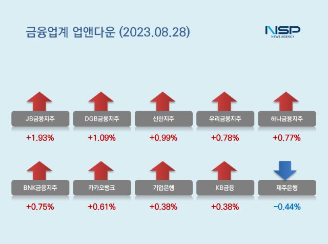 (서울=NSP통신) 강수인 기자 = 28일 코스피(+0.96%)와 코스닥(+1.11%)은 모두 상승했다. 이 가운데 은행주는 전거래일 대비 0.64% 상승했다. 은행주는 11종목 가운데 10종목이 상승, 1종목이 하락했다.
