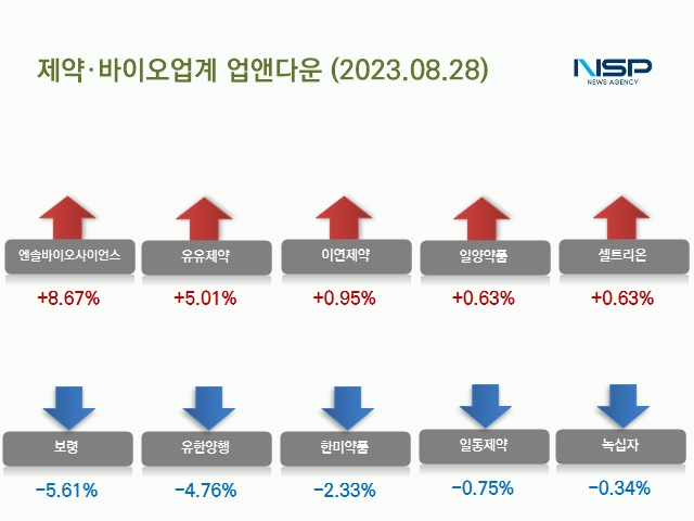 반면 한올바이오파마(-5.03%) 유한양행(-4.76%) 한미약품(-2.33%) 삼일제약(-1.72%) 동아쏘시오홀딩스(-1.37%) 대웅제약(-1.22%) JW홀딩스(-1.18%) 삼성바이오로직스(-0.92%) 광동제약(-0.77%) 일동제약(-0.75%) 일동홀딩스(-0.68%) 제일파마홀딩스(-0.53%) 삼진제약(-0.44%) 더메디팜(-0.40%) 유나이티드제약(-0.37%) 현대약품(-0.37%) 녹십자(-0.34%) 동아에스티(-0.32%) 등은 하락했다.