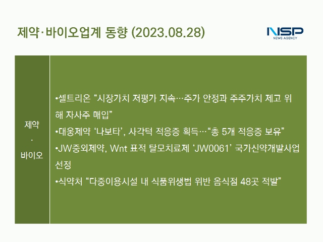 (서울=NSP통신) 김다은 기자 = 셀트리온과 셀트리온헬스케어가 약 1450억 규모 자사주 매입을 결정했다. 이와 함께 대웅제약의 보툴리눔톡신 ‘나보타’가 식품의약품안전처(식약처)로부터 양성교근비대(이하 사각턱) 적응증을 허가받았다.
