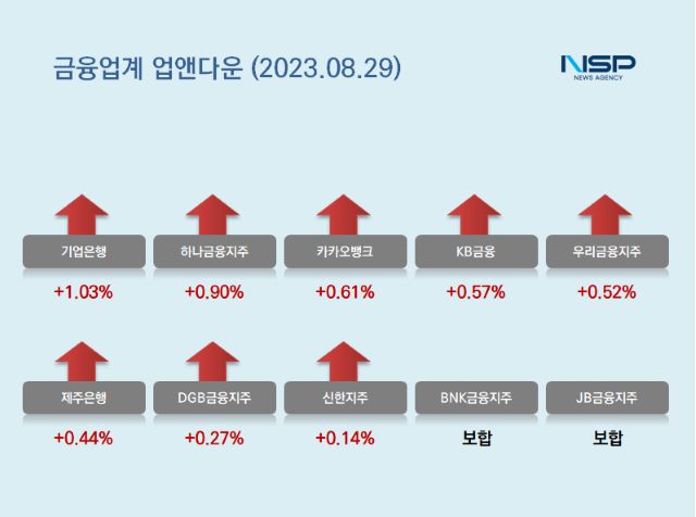 (서울=NSP통신) 강수인 기자 = 28일 코스피(+0.34%)와 코스닥(+0.75%)은 모두 상승했다. 이 가운데 은행주는 전거래일 대비 0.58% 상승했다. 은행주는 11종목 가운데 8종목이 상승, 3종목이 보합했다.