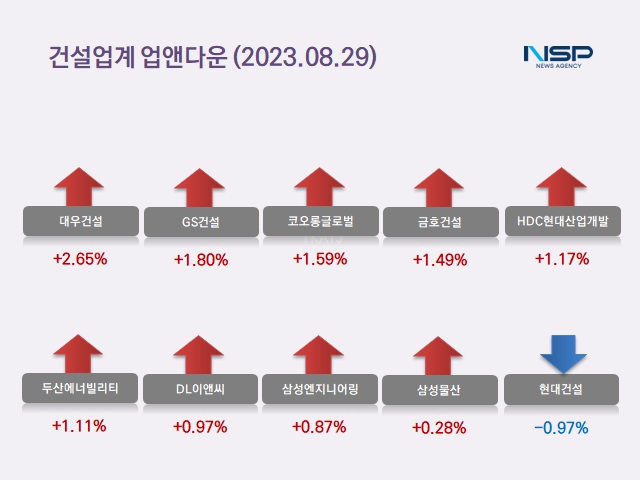 (서울=NSP통신) 정의윤 기자 = 29일 코스피(0.34%)와 코스닥(+0.75%)는 상승세를 보였다. 건설주는 전일 대비 0.89% 상승했다. 건설주는 84종목 가운데 68종목이 상승, 10종목이 하락했다. 보합세는 6종목이다.