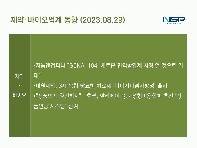 (서울=NSP통신) 김다은 기자 = 지놈앤컴퍼니가 식품의약품안전처에 신규타깃 항암제 ‘GENA-104’의 국내 임상 1상 시험계획(IND)을 제출했다. 이와 함께 대원제약이 당뇨병 3제 복합제인 다파시타엠서방정 4개 용량 제품을 출시한다.