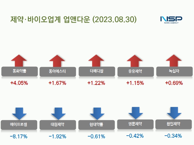 반면 대원제약(-1.92%) 일성신약(-1.36%) 경보제약(-0.93%) 삼진제약(-0.89%) JW중외제약(-0.88%) 대웅제약(-0.66%) HLB사이언스(-0.62%) 현대약품(-0.61%) 종근당홀딩스(-0.54%) 한미약품(-0.50%) 대웅(-0.49%) 명문제약(-0.42%) 하나제약(-0.41%) 일양약품(-0.37%) 종근당(-0.35%) 환인제약(-0.34%) 유한양행(-0.14%) 제일약품(-0.12%) 등은 하락했다.