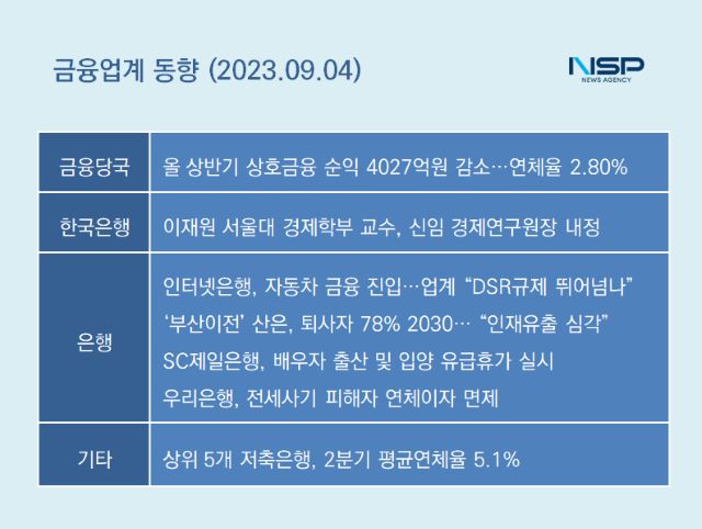 (서울=NSP통신) 강수인 기자 = KDB산업은행의 부산이전 소식이 들려오기 시작한 2020년부터 올해 상반기까지 168명이 중도 퇴직한 것으로 알려졌다. 그중 2030 비율이 78%로 우수 인재 유출에 대한 우려가 나온다. 한편 대환대출을 시작으로 인터넷전문은행의 자동차 대출 시장 진입이 시작됐다.
