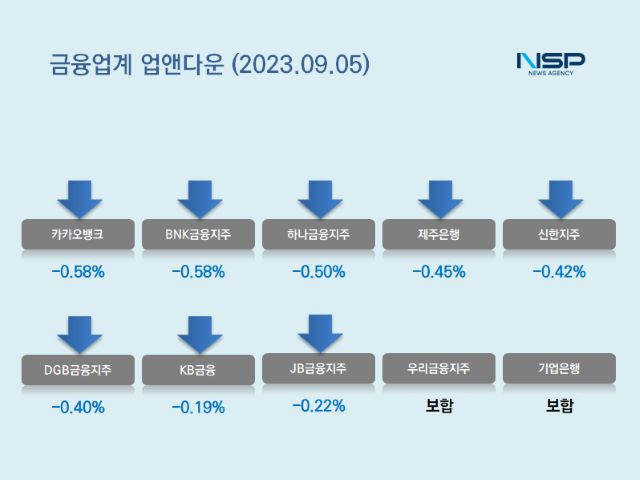 (서울=NSP통신) 강수인 기자 = 5일 코스피(-0.09%)와 코스닥(+0.25%)은 하락과 상승이 엇갈렸다. 이 가운데 은행주는 전거래일 대비 0.31% 하락했다. 은행주는 11종목 가운데 9종목이 하락, 2종목이 보합했다.