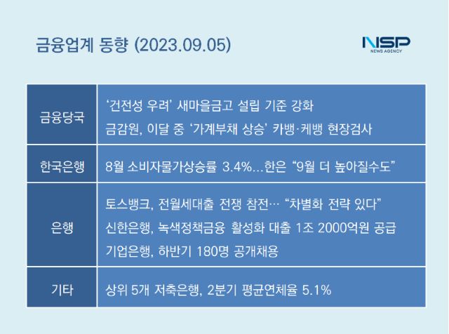 (서울=NSP통신) 강수인 기자 = 토스뱅크까지 전월세대출을 출시하며 인터넷전문은행의 전월세대출 삼파전이 펼쳐졌다. 전월세대출의 과열양상이 벌어진 것과 관련해 토스뱅크는 “대출을 받고 나서도 내 대출금을 관리할 수 있다는 것이 차별화 전략”이라고 밝혔다. 한편 한국은행은 9월 소비자물가상승률이 8월 3.4%를 다소 상회할 수도 있다는 전망을 내놨다.