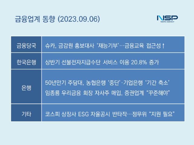 (서울=NSP통신) 강수인 기자 = 임종룡 우리금융지주 회장이 답보 상태인 우리금융지주 주가 부양을 위해 취임 첫 자사주 매입에 나섰다. 1만주의 주식을 매입했지만 증권업계는 “주가에 비해 매입 규모가 적다”며 “꾸준히 정기적으로 매입해야 시장에 신뢰를 줄 수 있다”는 반응이다. 한편 경제유튜버 슈카(전석재)가 금융감독원 홍보대사로 재능기부에 나섰다.