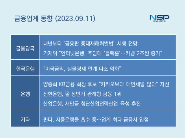 (서울=NSP통신) 강수인 기자 = 금융사고가 발생하면 CEO를 포함한 경영진이 책임을 짊어지는 이른바 ‘금융판 중대재해처벌법’이 이르면 내년 시행된다. 한편 첫 출근을 한 양종희 KB금융그룹 회장 후보자가 “KB금융이 카카오보다 대면채널이 많다”며 “이를 활용해 디지털 채널 진가발휘 하겠다”고 포부를 밝혔다.