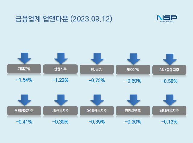 (서울=NSP통신) 강수인 기자 = 12일 코스피(-0.79%)와 코스닥(-1.59%)은 모두 하락했다. 이 가운데 은행주는 전거래일 대비 0.71% 하락했다. 은행주는 11종목 가운데 모두 하락했다.