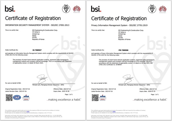 한편 GS건설은 지난해 과학기술정보통신부와 개인정보보호위원회의 공동 고시 기준에 따라 한국인터넷진흥원(KISA)에서 정보보호에 대한 인증(ISMS-P)를 받은 이후 올해 ISO 국제표준 정보보호 인증을 확보하며, 앞으로도 기업과 고객의 정보보호 수준을 높여 지속가능경영 기업 및 ESG 대표 기업으로 자리매김한다는 계획이다.