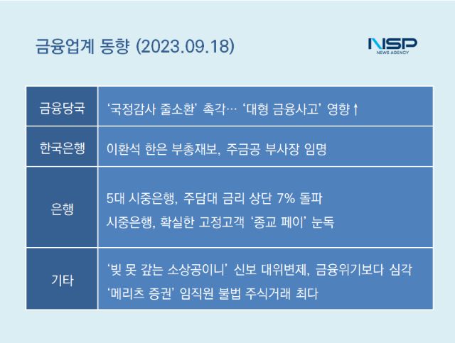 금융권 안팎에서 국정감사에 금융지주 회장들이 출석요구를 받을 것이란 의견들이 나온다. 1000억원대 횡령을 한 직원이 7년동안 벌였던 BNK경남은행, 직원들이 주식시장 미공개 정보로 본인은 물론 가족, 지인까지 130억원에 달하는 부당이익을 챙긴 KB국민은행, 고객 동의 없이 1000개가 넘는 주식 계좌를 개설한 DGB대구은행 등 저마다 역대급 금융사고 기록을 세웠기 때문. 금융당국도 수차례 ‘내부통제’를 강조해왔기 때문에 이번 국정감사를 피해갈 수 없는 이슈보인다.