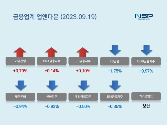 (서울=NSP통신) 강수인 기자 = 19일 코스피(-0.60%)와 코스닥(-0.83%)은 모두 하락했다. 이 가운데 은행주는 전거래일 대비 0.67% 하락했다. 은행주는 11종목 가운데 3종목이 상승, 6종목이 하락했다. 보합세는 2종목이다.