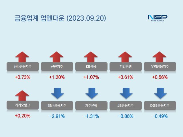 (서울=NSP통신) 강수인 기자 = 20일 코스피(+0.02%)와 코스닥(-0.13%)은 상승과 하락이 엇갈렸다. 이 가운데 은행주는 전거래일 대비 0.80% 하락했다. 은행주는 11종목 가운데 6종목이 상승, 5종목이 하락했다.