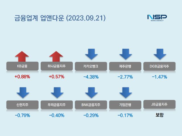 (서울=NSP통신) 강수인 기자 = 21일 코스피(-1.75%)와 코스닥(-2.50%)은 모두 하락했다. 이 가운데 은행주는 전거래일 대비 0.50% 하락했다. 은행주는 11종목 가운데 3종목이 상승, 7종목이 하락했다. 보합세는 1종목이다.