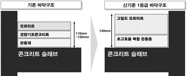 구조적 안정성과 시공성이 검증된 기존 뜬바닥 구조를 유지하되 정확한 방진설계 기술과 최신 소재를 적용함으로써 현장 시공성과 고성능을 동시에 실현했다. 즉, ‘신기준 1등급 바닥구조’는 기존 110mm의 마감 층이 적용되는 바닥구조 대비 마감 두께를 30mm 증가시키고, 방진 효율을 극대화함으로써 층간소음을 줄이는 것이 특징이다.