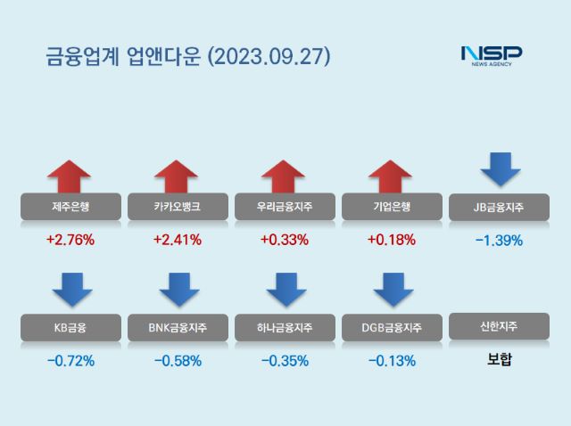 (서울=NSP통신) 강수인 기자 = 27일 코스피(+0.09%)와 코스닥(+1.59%)은 모두 상승했다. 이 가운데 은행주는 전거래일 대비 0.08% 상승했다. 은행주는 11종목 가운세 4종목이 상승, 6종목이 하락했다. 보합세는 1종목이다.