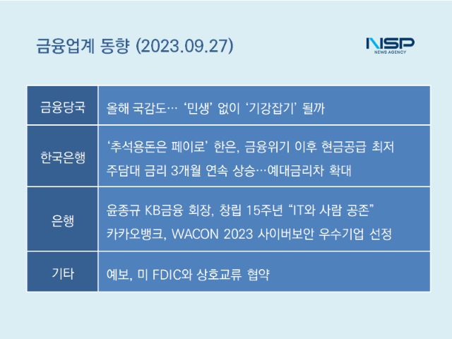 (서울=NSP통신) 강수인 기자 = 간편결제 ‘페이’의 등장으로 현금이 줄어들고 있다. 추석을 맞아 한국은행이 공급한 현금공급액도 4조원 아래로 떨어지면서 15년만에 최저 수준을 기록했다. 한편 주택담보대출 평균금리는 3개월 연속 오름세를 나타냈다. 이슈는 쌓였지만 금융지주 CEO는 없고 여야 갈등에 묻혀 ‘답이 없는’ 국정감사도 논란이다.