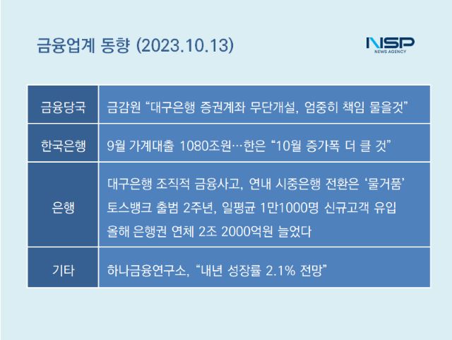 (서울=NSP통신) 강수인 기자 = 가계대출이 꾸준히 증가하면서 1080억원에 달하는 수준까지 올랐다. 한국은행은 가계대출 증가폭이 지난달보다 더 클 수 있다고 전망했다. 한편 금융감독원 검사 결과 대구은행에서 고객의 동의 없이, 또 고객의 연락처를 무단으로 바꿔치기해 1000개가 넘는 증권계좌를 개설한 것으로 드러났다.