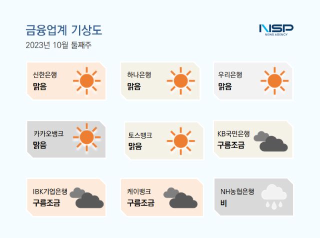 (서울=NSP통신) 강수인 기자 = 2023년 10월 2주차 금융업계 기상도는 신한은행·하나은행·우리은행·카카오뱅크·토스뱅크의 ‘맑음’, KB국민은행·IBK기업은행·케이뱅크의 ‘구름조금’, NH농협은행의 ‘비’로 기록됐다.