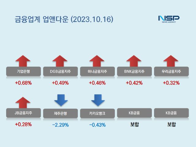 (서울=NSP통신) 강수인 기자 = 16일 코스피(-0.81%)와 코스닥(-1.49%)은 모두 하락했다. 이 가운데 은행주는 전거래일 대비 0.13% 상승했다. 은행주는 11종목 가운데 6종목이 상승, 3종목이 하락했다. 보합세는 2종목이다.