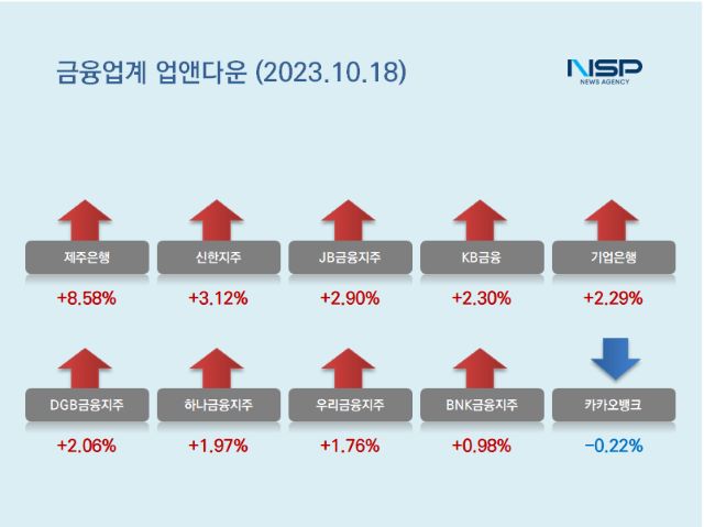 (서울=NSP통신) 강수인 기자 = 18일 코스피(+0.10%)와 코스닥(-1.40%)은 상승과 하락이 엇갈렸다. 이 가운데 은행주는 전거래일 대비 2.06% 상승했다. 은행주는 11종목 가운데 10종목이 상승, 1종목이 하락했다.