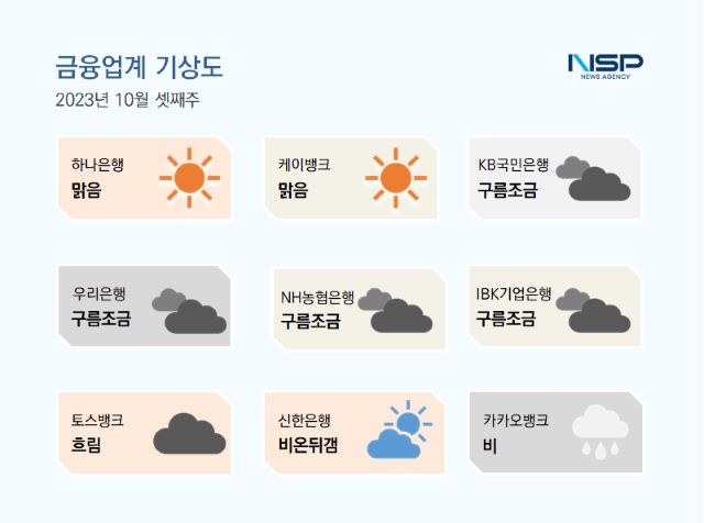 (서울=NSP통신) 강수인 기자 = 2023년 10월 3주차 금융업계기상도는 하나은행·케이뱅크의 ‘맑음’, KB국민은행·우리은행·NH농협은행·IBK기업은행의 ‘구름조금’, 토스뱅크의 ‘흐림’, 신한은행의 ‘비온뒤갬’, 카카오뱅크의 ‘비’로 기록됐다.