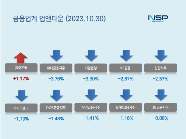 이날 유일하게 상승한 종목은 제주은행이다. 제주은행은 전거래일 대비 1.12%(120원) 올라 1만820원으로 장을 마쳤다.