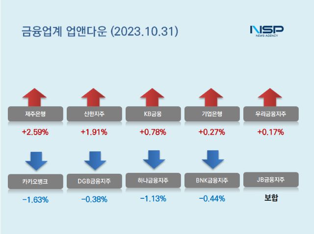 (서울=NSP통신) 강수인 기자 = 31일 코스피(-1.41%)와 코스닥(-2.78%)은 모두 하락했다. 이 가운데 은행주는 전거래일 대비 0.30% 상승했다. 은행주는 11종목 가운데 5종목이 상승, 5종목이 하락했다. 보합세는 1종목이다.