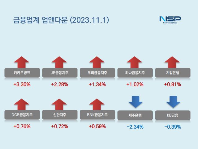 (서울=NSP통신) 강수인 기자 = 1일 코스피(+1.03%)와 코스닥(+0.43%)은 모두 상승했다. 이 가운데 은행주는 전거래일 대비 0.86% 상승했다. 은행주는 11종목 가운데 8종목이 상승, 3종목이 하락했다.