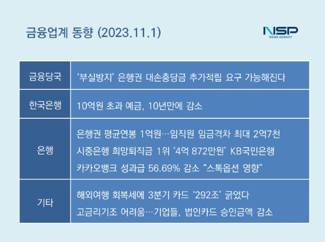 (서울=NSP통신) 강수인 기자 = 윤석열 대통령의 은행권 이자장사를 정조준한 ‘종노릇’ 발언 이후 은행권 임직원의 평균 근로소득이 공개됐다. 5대 시중은행(KB국민·신한·하나·우리·NH농협)의 임직원 1인당 평균소득은 1억 1006만원으로 집계됐으며 임원과 직원 사이 임금 격차는 최대 2억 7000만원 이상 벌어졌다. 한편 고금리 기조에 어려움을 겪는 기업들이 10억원 초과 예금을 해지해 빚을 갚고 법인카드 이용도 줄이고 있다.