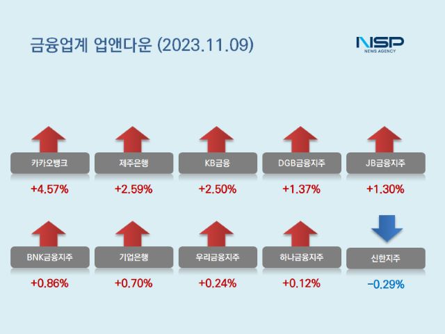 (서울=NSP통신) 강수인 기자 = 9일 코스피(+0.23%)와 코스닥(-1.00%)은 상승과 하락이 엇갈렸다. 이 가운데 은행주는 전거래일 대비 1.35% 상승했다. 은행주는 11종목 가운데 10종목이 상승, 1종목이 하락했다.