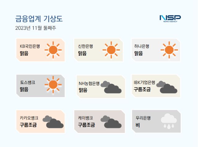 (서울=NSP통신) 강수인 기자 = 2023년 11월 2주차 금융업계기상도는 KB국민은행·신한은행·하나은행·토스뱅크의 ‘맑음’, NH농협은행·IBK기업은행·카카오뱅크·케이뱅크의 ‘구름조금’, 우리은행의 ‘비’로 기록됐다.