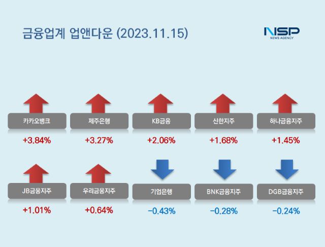 제주은행은 전거래일 대비 3.27%(280원) 올라 8850원으로 장을 마감했고 KB금융은 전거래일 대비 2.06%(1100원) 상승해 5만4600원으로 장을 마쳤다.