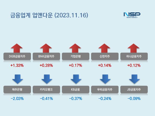 (서울=NSP통신) 강수인 기자 = 16일 코스피(+0.01%)와 코스닥(+0.37%)은 모두 상승했다. 이 가운데 은행주는 전거래일 대비 0.09% 하락했다. 은행주는 11종목 가운데 5종목이 상승, 6종목이 하락했다.