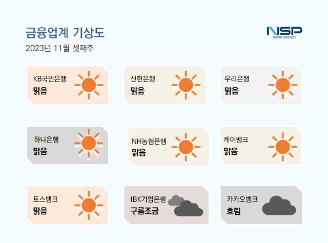 (서울=NSP통신) 강수인 기자 = 2023년 11월 3주차 금융업계기상도는 KB국민은행·신한은행·하나은행·우리은행·NH농협은행·케이뱅크·토스뱅크의 ‘맑음’, IBK기업은행 ‘구름조금’, 카카토뱅크의 ‘흐림’으로 기록됐다.