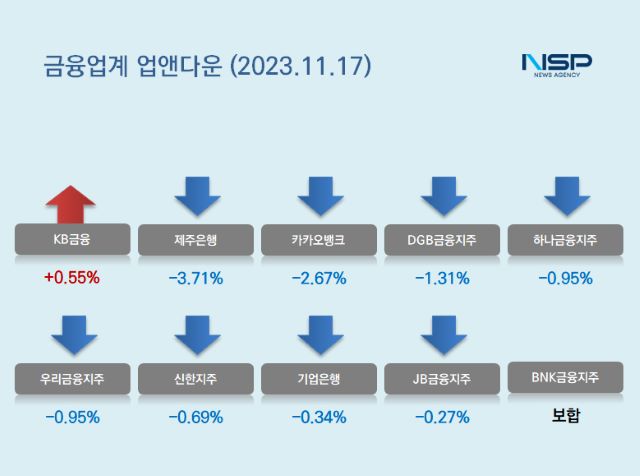 (서울=NSP통신) 강수인 기자 = 17일 코스피(-0.74%)와 코스닥(-1.49%)은 모두 하락했다. 이 가운데 은행주는 전거래일 대비 0.67% 하락했다. 은행주는 11종목 가운데 2종목이 상승, 2종목이 하락했다. 보합세는 1종목이다.