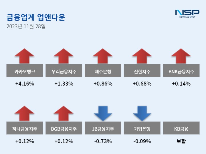 (서울=NSP통신) 강수인 기자 = 28일 코스피(+1.05%)와 코스닥(+0.76%)은 모두 상승했다. 이 가운데 은행주는 전거래일 대비 0.86% 상승했다. 은행주는 11종목 가운데 7종목이 상승, 3종목이 하락했다. 보합세는 1종목이다.